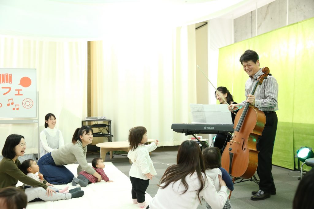なみきスクエアでは、芸術に触れ合う機会が少ない乳幼児やその親を対象にした芸術体験事業「はじめての芸術」を年に数回お届けしています。今回は「はじめての芸術」と「ママカフェ」がコラボして、親子で音楽を鑑賞したり、お茶の時間を楽しみながら、演奏者との直接の会話やママ同士の交流を深める企画を実施しました。
