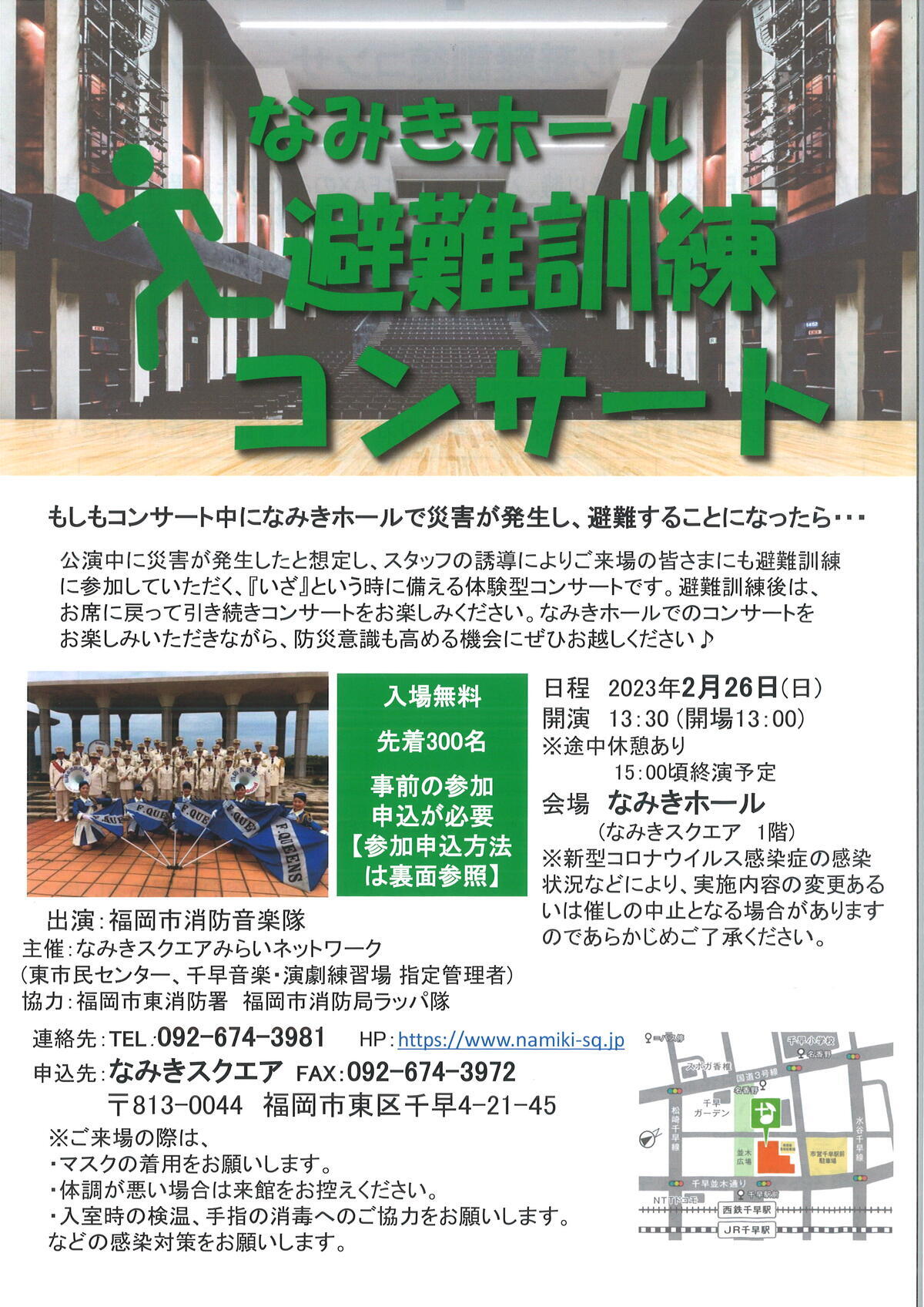 | 申込方法 | 1月10日(火)午前9時以降に ハガキ、FAXのいずれかにて 必要事項(「避難訓練コンサート参加申込」・氏名・住所・電話番号)を記入の上お申込みください *ご家族で参加の場合は参加者全員の氏名をご記入ください |