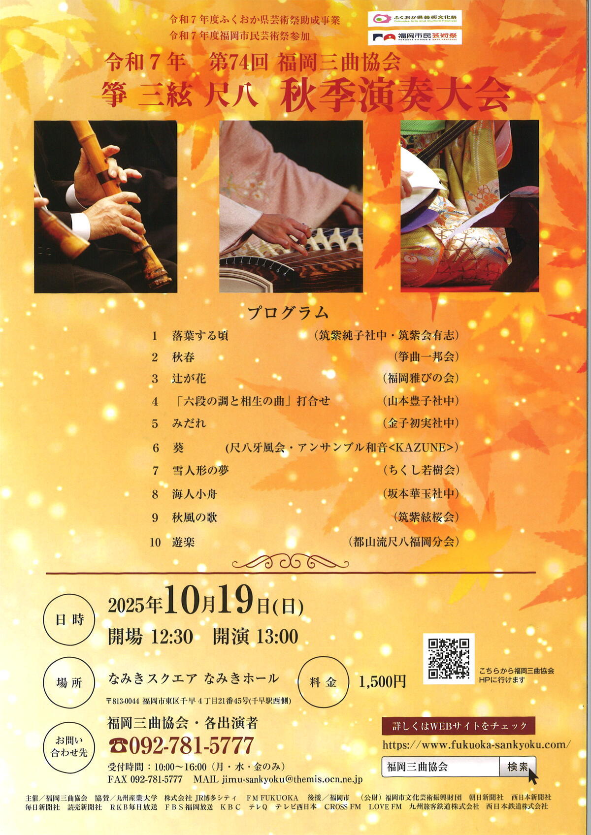 お問い合わせ先 | 福岡三曲協会・各出演者 ☎092-781-5777 受付時間:10:00~16:00(月・水・金のみ) Mail:jimu-sankyoku@themis.ocn.ne.jp |