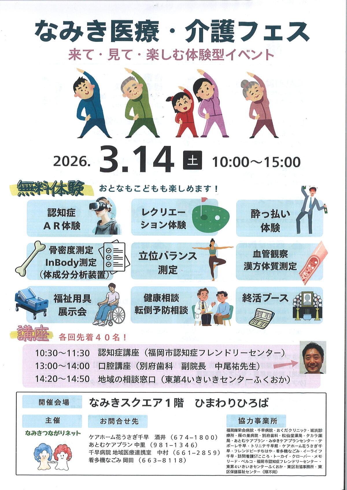 | 無料体験 | *おとなもこどもも楽しめます! ●認知症AR体験 ●レクリエーション体験 ●酔っ払い体験 ●骨密度測定・InBody測定(体成分分析装置) ●立体バランス測定 ●血管観察・漢方体質測定 ●福祉用具展示会 ●健康相談・転倒予防相談 ●終活ブース |