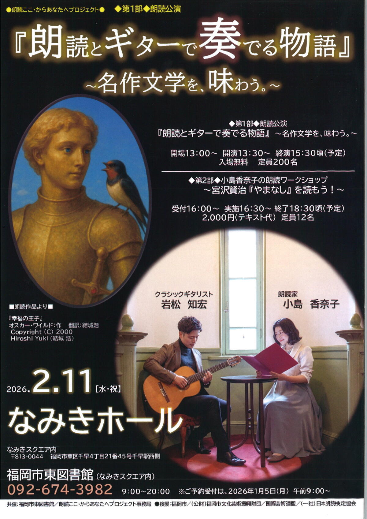 | 開催日時 | 2026年2月11日(水・祝) 【第1部:朗読公演】 開演13:30(開場13:00) *終演15:30頃予定 【第2部:朗読ワークショップ】 開始16:30(受付16:00) *終了18:30頃予定 |