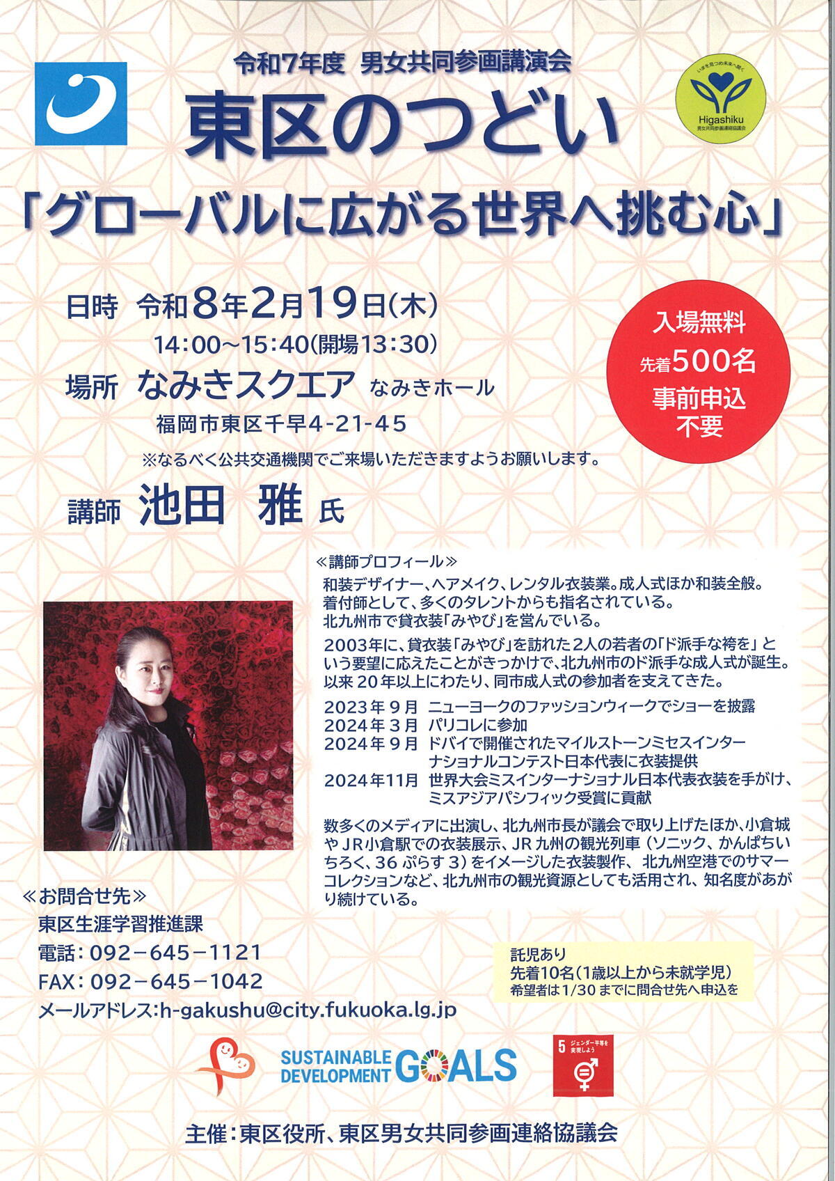 | お問い合わせ先 | 東区生涯学習推進課 TEL:092-645-1121 FAX:092-645-1042 mail:h-gakushu@city.fukuoka.lg.jp |