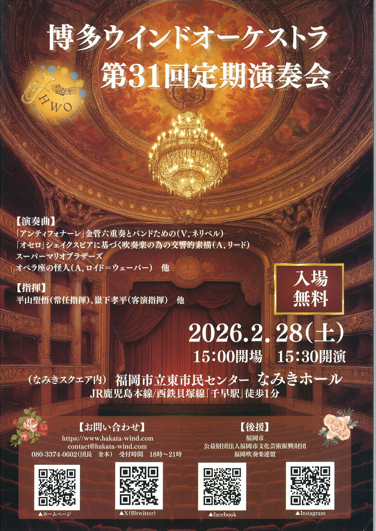 | お問い合わせ先 | 博多ウインドオーケストラ https://www.hakata-wind.com メール:contact@hakata-wind.com TEL:080-3374-0602(団長 金本) 受付時間 18時~21時 |