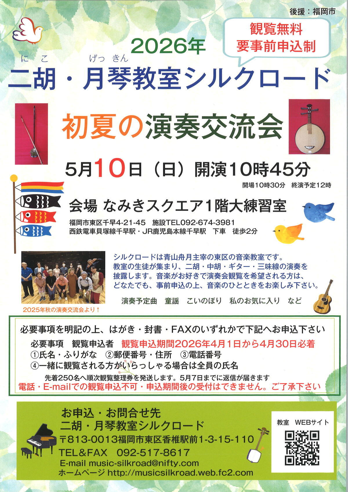 | お申込み・お問い合わせ先 | 二胡・月琴教室シルクロード 〒813-0013 福岡市東区香椎駅前1-3-15-110 E-Mail: music-silkroad@nifty.com TEL&FAX:092-517-8617 HP:http://musicsilkroad.web.fc2.com |