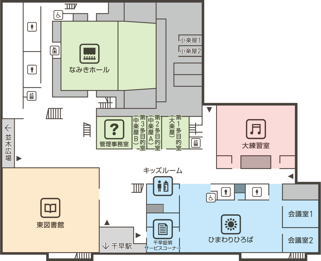 | 休館日 | 毎月最終月曜日、12月28日から翌1月3日(ひまわり広場の一部共用スペースは千早証明サービスコーナーと同じ) |